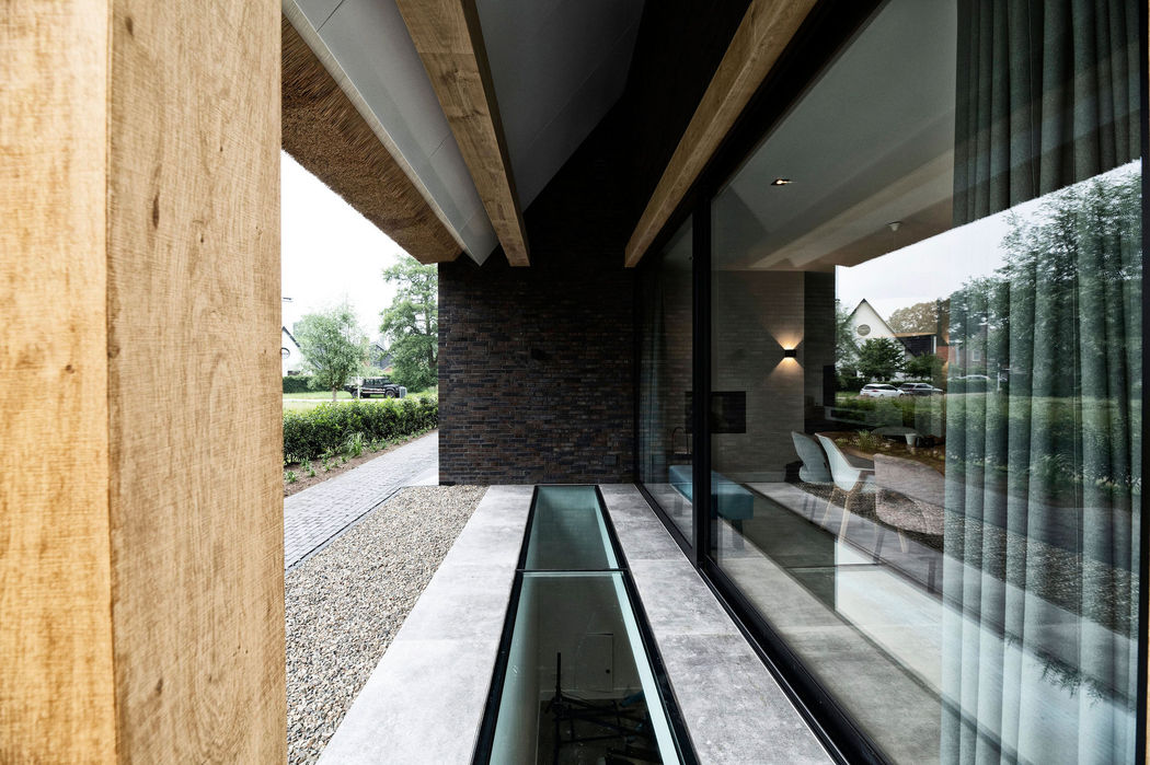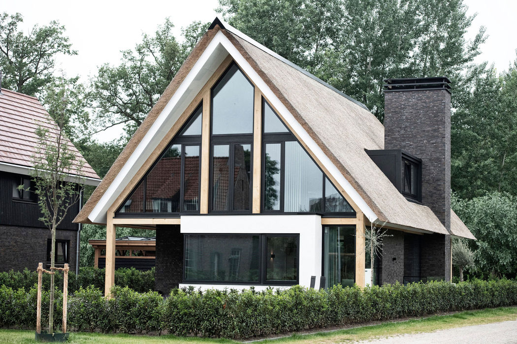 Moderne landelijke woning met rieten kap en robuuste materialen