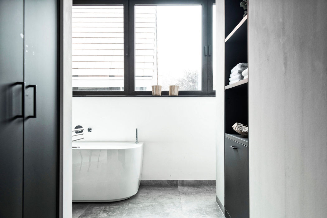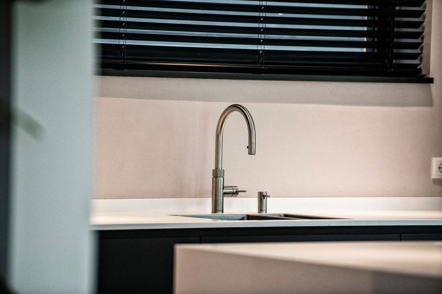 Functionaliteit en esthetiek gaan hier hand in hand. De zwarte accenten in het interieur – zoals de keukenkasten, stalen deuren en de open haard – vormen een krachtig contrast en geven de ruimte een luxueuze uitstraling. Dit interieurontwerp is een perfecte balans tussen moderniteit en gezelligheid, met aandacht voor detail en comfort.
